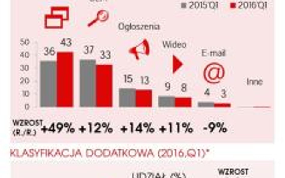 Najszybciej rosła reklama graficzna (bez wideo): o 43 proc., która stanowiła już połowę wszystkich wydatków. - Duży wpływ na tempo rozwojowe tego formatu ma reklama w mediach społecznościowych, której wartość wzrosła o 136 proc. – podaje IAB. Kolejne były: reklama w wyszukiwarkach (wzrost r/r o 33 proc., udział w rynku na poziomie 12 proc.) i ogłoszenia (udział na poziomie 13,3 proc., wzrost r/r o 14 proc.). Na reklamę wideo firmy wydały o 11 proc. więcej niż rok wcześniej i stanowiła ona 8 proc. reklamowego tortu. - Należy także zwrócić uwagę na utrzymującą się wysoką dynamikę wydatków reklamowych w urządzeniach mobilnych, które wzrosły o 89 proc. i pozyskały 18 proc. tortu reklamowego on-line – podaje IAB.