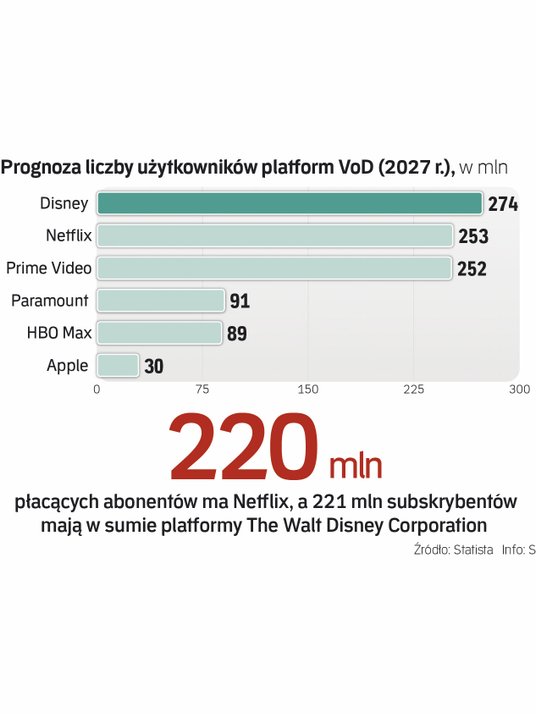 Gdy The Walt Disney Corporation ogłosiła wyniki kwartalne, niektóre media ogłosiły, że platforma Disney+ przegoniła Netfliksa pod względem liczby płacących abonentów. Tak naprawdę wszystkie serwisy Disneya mają obecnie w sumie 221 mln subskrybentów, co daje grupie, ale nie Disney+ plus przewagę nad najsilniejszym graczem na tym rynku (Netflix informował ostatnio o 220 mln subskrybentów). Sama platforma Disney+ i należący do niej Hotstar w lipcu miały 152,1 mln subskrybentów, o ponad 30 proc. więcej niż przed rokiem. Licząc bez Hostaru, za Disney+ płaciło 93,6 mln użytkowników.