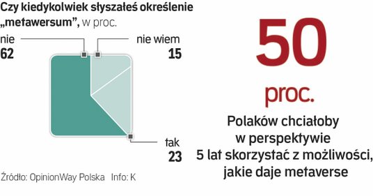 Choć mogłoby się wydawać, że metawersum to temat, o którym od jakiegoś czasu mówi się, pisze i dyskutuje, to jedynie mniej niż co czwarty Polak zna to pojęcie, a przeważająca część z nich (64 proc.) kojarzy je tylko z nazwy. Ci, którzy są w stanie zdefiniować, czym jest metaverse, zazwyczaj utożsamiają je z wirtualną rzeczywistością (VR) oraz wskazują na związek z Facebookiem, możliwość interakcji z innymi oraz wykorzystanie technologii VR – wynika z badań OpinionWay Polska, które „Rzeczpospolita” publikuje jako pierwsza. Eksperci twierdzą, że brak znajomości pojęcia nie oznacza niechęci do metawersum. Po przedstawieniu możliwości, jakie może ono oferować, połowa respondentów deklarowała gotowość skorzystania w ciągu pięciu lat z tego typu rozwiązań.