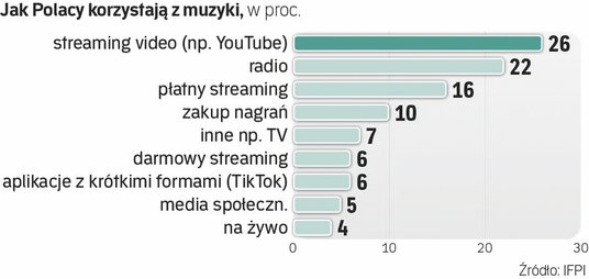 Już 30 proc. Polaków korzysta z płatnych serwisów muzycznych, a podobna grupa słucha muzyki bez płacenia, ale w zamian np. za słuchanie reklam – wynika z najnowszego raportu Międzynarodowej Federacji Przemysłu Fonograficznego. Wszystko to generuje potężne przychody: światowy rynek streamingu muzyki w 2021 r. wart był 29,5 mld dol., a w 2022 jego wartość ma przekroczyć 34,5 mld dol.