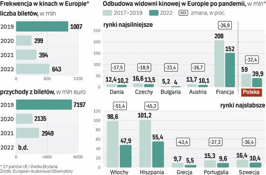 Na tym tle polski rynek zachował się słabiej: wg danych uzyskanych przez EAO od Polskiego Instytutu Sztuki Filmowej, widownia w polskich kinach urosła o około 51 proc., do 39,9 mln sprzedanych biletów.