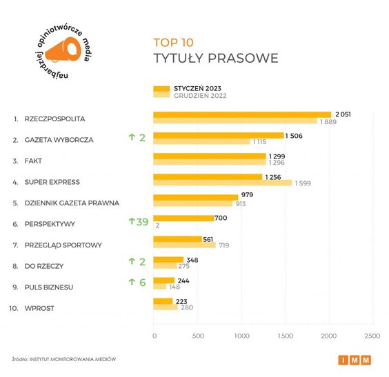 Skok o dwie pozycje i miejsce drugie wśród tytułów prasowych należy do "Gazety Wyborczej", cytowanej w ubiegłym miesiącu 1,5 tys. razy, a podium zamyka "Fakt" z liczbą 1,3 tys. wzmianek.