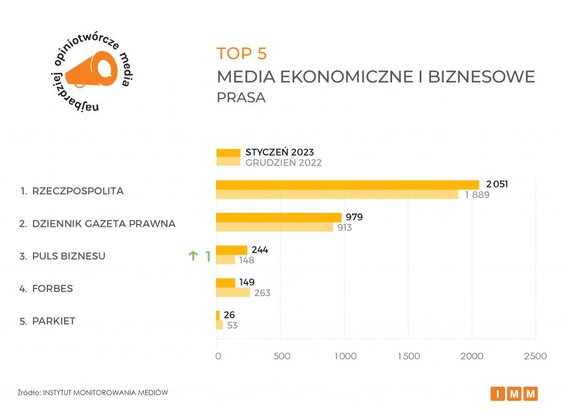 Na podium najbardziej opiniotwórczych tytułów prasowych o profilu ekonomiczno–biznesowym niezmiennie utrzymuje się "Rzeczpospolita". Kolejne miejsce, z ponad dwukrotnie mniejszą liczbą cytowań zajmuje "Dziennik Gazeta Prawna", a trzecie miejsce podium ze wzrostem o jedno oczko należy do "Puls Biznesu". Kolejne miejsca w zestawieniu zajęli "Forbes" oraz "Parkiet".