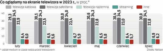 Są natomiast dane dla polskiego rynku. Wskazują one, że chociaż spędzamy na platformach streamingowych stopniowo coraz więcej czasu, to jednak nie jest to nadal duża konkurencja dla telewizji kablowej czy coraz słabiej sprzedającej się satelitarnej. Największy ubytek widać w wypadku cyfrowej telewizji naziemnej, co niektórzy wyjaśniają jej mniejszym zasięgiem technicznym z powodu sposobu refarmingu.