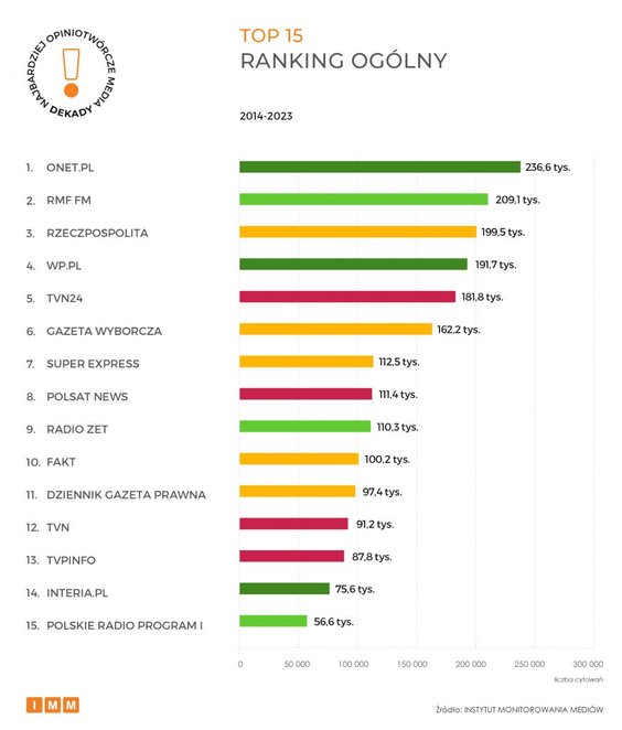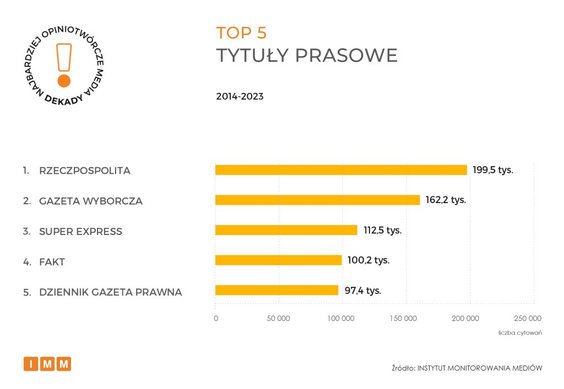 Zestawienie TOP 5 uzupełniają Fakt (100,2 tys. powołań) i Dziennik Gazeta Prawna (97,4 tys. cytowań).