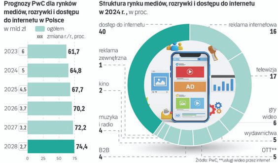 Zdaniem ekspertów PwC w kolejnych latach rynek, na który składa się dostęp do internetu, telewizja, reklama internetowa, usługi wideo platform cyfrowych (OTT), wydawnictwa prasowe i książkowe, gry wideo czy w końcu kina i muzyka, będzie rósł, ale coraz wolniej. W 2028 r., gdy ma być wart 74,4 mld zł, jego wzrost ograniczyć ma się do niecałych 3 proc.