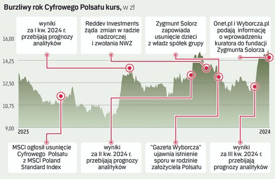Za każdym razem, gdy notowania Cyfrowego Polsatu idą w górę dzieje się coś, co uderza w kurs akcji. We wtorek spadał on chwilami o ponad 8 proc. poniżej 14 zł po tym jak media opublikowały teksty nt. nieznanej do tej pory decyzji sądu w Liechtensteinie. To jedno z rozstrzygnięć w sporze między dziećmi Zygmunta Solorza a nim samym wspieranym przez nową żonę – Justynę Kulkę – o władzę nad majątkiem zbudowanym przez założyciela Polsatu.
