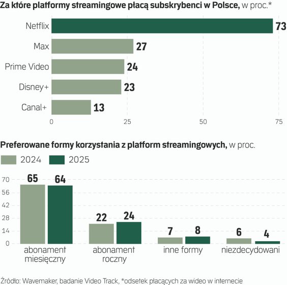 To jednak nie znaczy, że podwyżki są dla użytkowników serwisów streamingowych obojętne. Z badania Wavemakera wynika, że polscy konsumenci częściej wybierają teraz roczne plany rozliczeniowe, w których miesięczna opłata wypada zwykle atrakcyjniej niż w odnawianej co miesiąc subskrypcji. Mimo tego dane, do których dostęp uzyskaliśmy, wskazują, że do 28 proc. wzrósł odsetek klientów wydających na streaming więcej niż 50 zł miesięcznie (rok temu – 21 proc.).