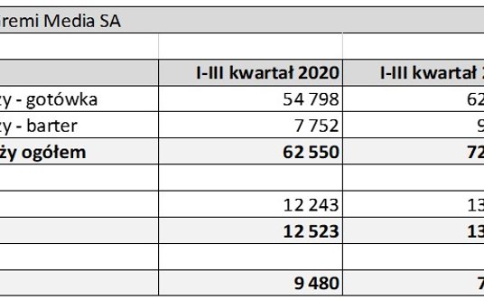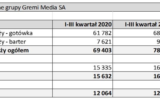 W ciągu trzech kwartałów br. notowana na NewConnect spółka Gremi Media wypracowała 62,6 mln zł przychodów, o 13,6 proc. mniej niż rok wcześniej, przychody gotówkowe skurczyły się o 12,6 proc., do 54,8 mln zł.