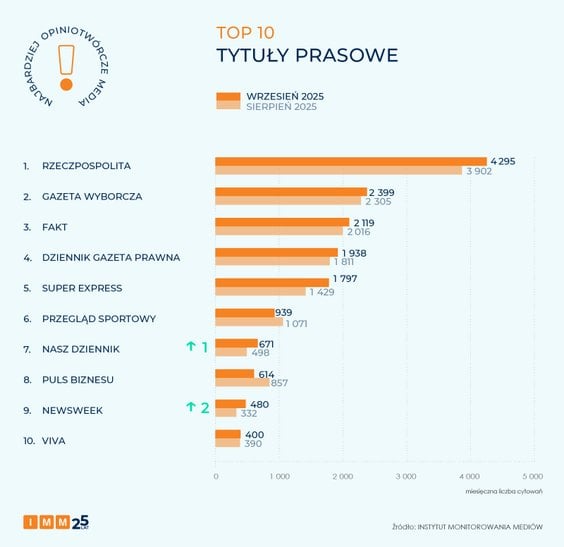 Najbardziej opiniotwórczym medium września, z awansem o jedną pozycję w porównaniu z poprzednim zestawieniem, została „Rzeczpospolita” z wynikiem 4,3 tys. cytowań. We wrześniu ujawniliśmy m.in., że w dom w Wyrykach na Lubelszczyźnie najprawdopodobniej uderzyła rakieta wystrzelona z wojskowego samolotu, który próbował strącić rosyjski dron.