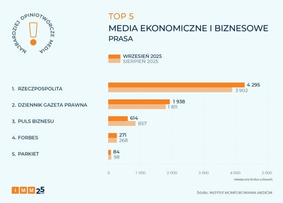 Zestawienie najczęściej cytowanych tytułów prasowych we wrześniu, podobnie jak w poprzednich miesiącach, otwiera „Rzeczpospolita” z liczbą 4,3 tys. odniesień w innych mediach.