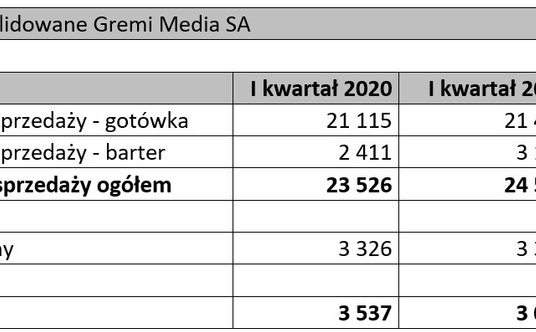 - II połowa marca przyniosła poważne załamanie na rynku dystrybucji prasy drukowanej a także na rynku reklamowym i dlatego nie udało nam się poprawić przychodów – skomentował Tomasz Jażdżyński, prezes Gremi Media. - Dzięki kontroli kosztów nie doszło jednak do naruszenia rentowności prowadzonego biznesu, a wręcz poprawy. Względną odporność na postępujące załamanie rynkowe uzyskaliśmy dzięki konsekwentnie realizowanej transformacji cyfrowej - podkreślił. Zarząd wskazuje, że produkty cyfrowe są rentowniejsze, co pozwala spółce realizować cele finansowe spółki mimo spowodowanego COVID-19 spadku przychodów.