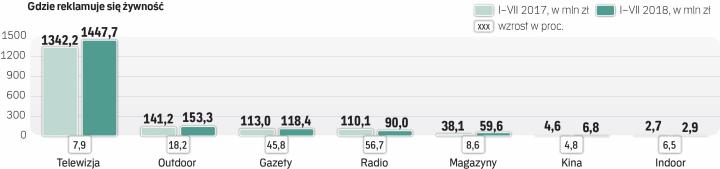 Inaczej wygląda sytuacja, jeśli ocenimy wzrost nakładów. Żywiołowo rosną one na reklamę żywności w zaniedbywanych nieco radiu i gazetach. Tu nakłady wzrosły: w radiu o 56 proc., do 60 mln zł, a w gazetach o 46 proc., do 6,8 mln zł. Wydatki na promocję na szklanym ekranie co prawda także rosły, ale w znacznie mniejszym tempie – 7,9 proc.