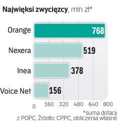 Inea i Play najwidoczniej obawiały się konkurencji i w trzech na cztery przypadkach wnioskowały o mniej pieniędzy niż mogły. Maksymalna kwota dotacji wynosiła bowiem według naszych obliczeń 243 mln zł.