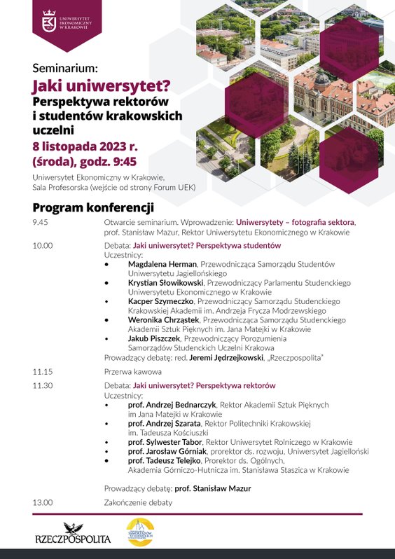 Wprowadzeniem do wydarzenia będzie wystąpienie Stanisława Mazura, prof. UEK, rektora Uniwersytetu Ekonomicznego w Krakowie, zatytułowane „Uniwersytety – fotografia sektora”.