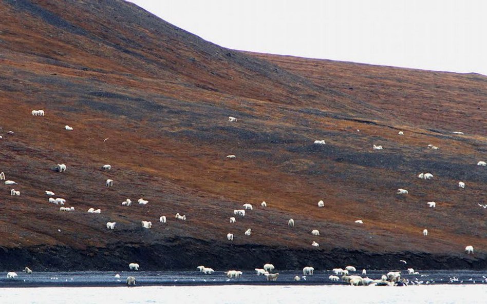 Niedźwiedzie polarne potrzebują lodu morskiego, aby przetrwać, ponieważ jest to niezbędna platforma do polowań na foki, ich główne źródło pożywienia. Podróżują po lodzie, szukają dziur oddechowych lub miejsc gdzie foki spodziewają się potomstwa. Gdy lód stopnieje późną wiosną, poszczą na lądzie, czekając na ponowne uformowanie się pokrywy lodowej i początek kolejnego okresu polowań. Niedźwiedzie jednak mogą spożywać i przechowywać duże ilości tłuszczu, co działa na ich korzyść i daje szansę przeżycia lata. Często spotykano je w miejscach, gdzie morze wyrzuciło na ląd lub rozmarzająca tafla lodowa uwolniła ze swojego uścisku, ogromne tusze martwych wielorybów. Często obserwowano duże grupy niedźwiedzi, nawet 40-60 sztuk, żerujące w tej letniej stołówce. W 2017 roku zaobserwowano rekordowo duże zgromadzenie ponad 180 niedźwiedzi w jednym miejscu. Poszczególne zwierzęta często powracają do tej samej tuszy przez wiele lat.