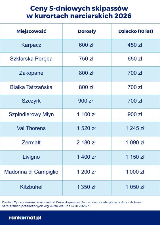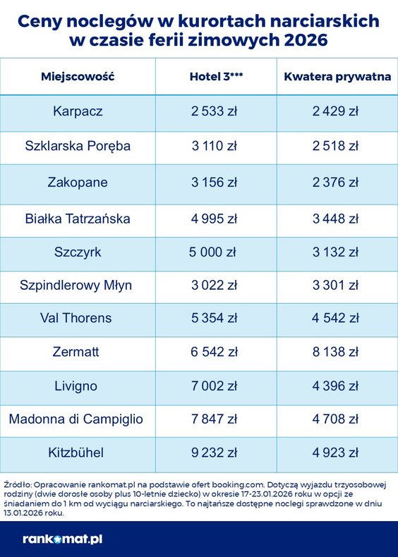 Rankomat.pl sprawdza koszty tygodniowego wyjazdu w polskie i zagraniczne góry w wybranych miejscowościach. Pod lupą znalazły się stawki w hotelach i kwaterach prywatnych ze śniadaniami, a także wydatki na zakup pięciodniowego skipassu Dzisiejsze ceny noclegów w okresie ferii zimowych analitycy porównują z tymi obowiązującymi rok temu. Z analizy Rankomat.pl wynika, że w 2026 r. zimowy wypoczynek w górach nadal częściej opłaca się spędzić w kraju niż za granicą.