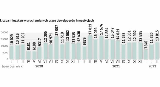 – Polacy w marcu 2022 r. wyznaczyli kolejny historyczny rekord popytu na kredyty mieszkaniowe: w ciągu zaledwie jednego miesiąca zawnioskowali o pożyczki rzędu 20 mld zł. Jednak ten rekord to nie efekt optymizmu wynikającego z odżywania gospodarki i uwolnienia dostępu do kredytów po miesiącach zakręcenia kurków z hipotekami – jak w marcu 2021 r. – zwraca uwagę ekspert. – Tym razem mieliśmy zdarzenie jednorazowe – chęć złożenia wniosku kredytowego tuż przed wprowadzeniem nowych zaleceń Urzędu Komisji Nadzoru Finansowego utrudniających dostęp do hipotek (surowsze kryteria badania zdolności – red.). Nie dziwi więc, że deweloperzy nie wyznaczyli kolejnego rekordu liczby rozpoczynanych inwestycji, ale „jedynie” osiągnęli bardzo przyzwoity wynik – wyjaśnia.