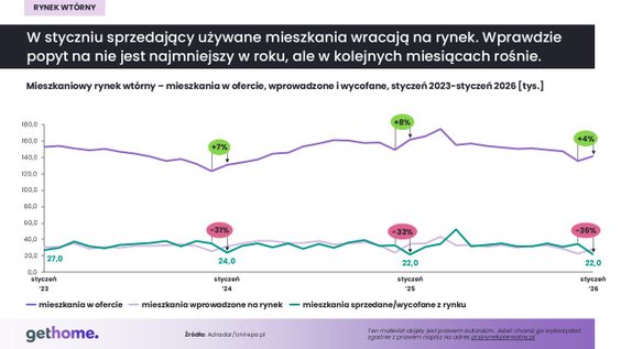 Z danych przeszukiwarki portali nieruchomości Adradar wynika, że pod koniec stycznia w całym kraju było ok. 141,5 tys. unikatowych ofert sprzedaży mieszkań, o 4 proc. więcej niż pod koniec 2025 r. Jednocześnie ich liczba była o ok. 12 proc. mniejsza niż w styczniu ubiegłego roku.