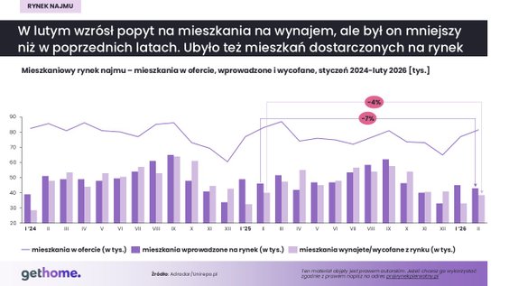 – Typowa dla tego okresu fala nowych ogłoszeń okazała się jednak słabsza niż zwykle. W lutym na rynek trafiło ok. 43 tys. ofert wynajmu mieszkań – o 4 proc. mniej niż w styczniu i o 7 proc. mniej niż rok wcześniej. Także w porównaniu z poprzednimi latami liczba nowych ogłoszeń była w tym okresie wyraźnie mniejsza – zaznacza Marek Wielgo.