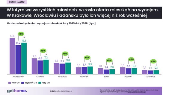 Serwis podaje, przywołując dane przeszukiwarki portali nieruchomości Adradar, że pod koniec lutego w całym kraju było dostępnych ok. 81,5 tys. unikatowych ofert wynajmu mieszkań. To o 6 proc. więcej niż miesiąc wcześniej, ale o 2 proc. mniej niż rok temu.