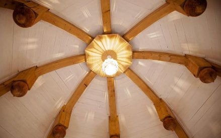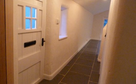 Wnętrza są wykończone w tradycyjny sposób z bielonymi ścianami i drewnianymi wykończeniami stropów oraz podłogami z drewnianych desek.