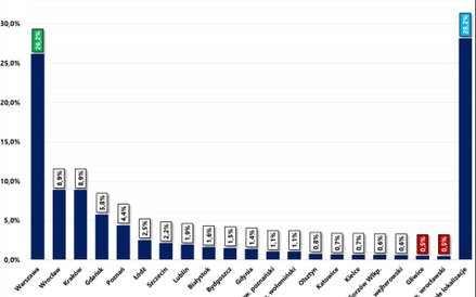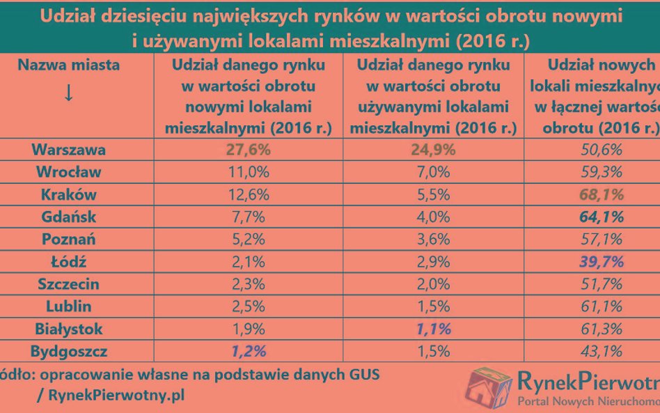 Warszawie (26,2 proc. wartości lokali mieszkalnych sprzedanych w 2016 r.) Wrocławiu (8,9 proc. wartości lokali mieszkalnych sprzedanych w 2016 r.) Krakowie (8,9 proc. wartości lokali mieszkalnych sprzedanych w 2016 r.) Gdańsku (5,8 proc. wartości lokali mieszkalnych sprzedanych w 2016 r.) Poznaniu (4,4 proc. wartości lokali mieszkalnych sprzedanych w 2016 r.) Łodzi (2,5 proc. wartości lokali mieszkalnych sprzedanych w 2016 r.)