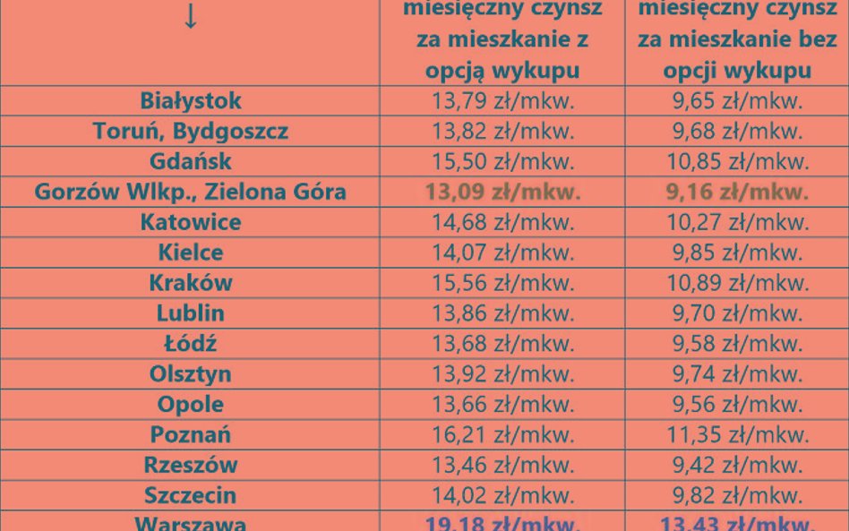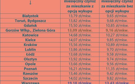 Planowane stawki wynoszą od 9,16 zł za mkw. (Zielona Góra/Gorzów Wielkopolski) do 13,43 zł/mkw. (Warszawa). To czynsze bez opcji wykupu. Z wykupem w ciągu 30 lat jest to od 13,09 zł za mkw. (Zielona Góra/Gorzów Wielkopolski) do 19,18 zł/mkw. (Warszawa) Nawet limit dla Warszawy z opcją wykupu mieszkania w ciągu 30 lat jest znacznie niższy od wstępnie podawanego maksimum (24 zł za mkw.). Trzeba również odnotować, że brak standardowej opcji wykupu mieszkania na własność zawsze skutkuje obniżeniem stawki czynszowej o 30 proc.