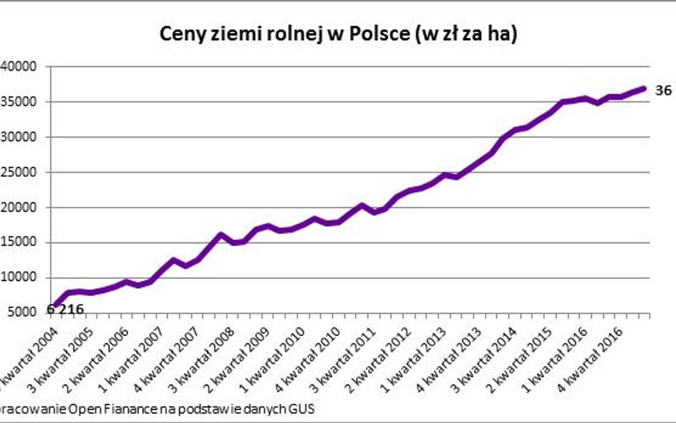 Powoli rosnące ceny i obroty to obraz rynku ziemi rolnej po ponad roku od wprowadzenia nowych zasad zakupu gruntów. Polacy uczą się żyć z nowymi ograniczeniami, a obawy przed spadkami cen okazują się płonne. 36,9 tys. zł za ha - to przeciętna cena, jaką należy płacić za hektar ziemi ornej w Polsce. Dane te dotyczą drugiego kwartału 2017 roku. W ciągu trzech miesięcy przeciętna rolna parcela zdrożała o ponad 500 złotych, a w ciągu roku już bez mała o 2 tys.
