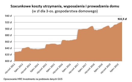 - Najnowsze dane sugerują, że na utrzymanie domu statystyczna polska trzyosobowa rodzina wydaje przeciętnie 922,5 złotych - wynika z szacunków HRE Investments. Bartosz Turek, główny analityk firmy, podaje, że to o 1,6% proc. więcej niż w analogicznym okresie przed rokiem.