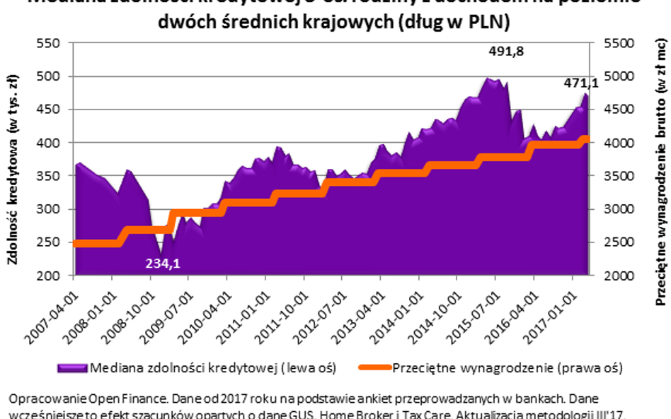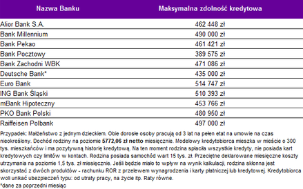 - Trzyosobowa rodzina, w której oboje rodziców pracuje, powinna móc zadłużyć się na zakup mieszkania na kwotę 471 tys. zł. Wartość ta jest medianą, a więc połowa banków chciałaby modelowej rodzinie pożyczyć więcej, a połowa zaoferowałaby mniejszą kwotę.