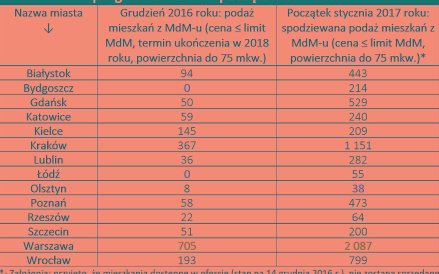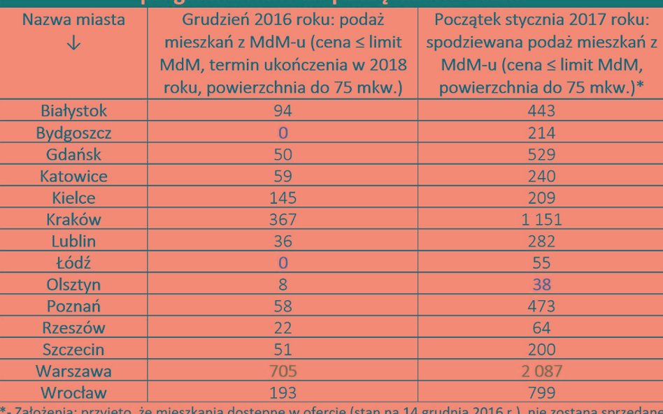 Spory deficyt nowych lokali z dopłatą prawdopodobnie będzie widoczny w Rzeszowie Rzeszowie, Olsztynie oraz Łodzi. Problemy demograficzne sprawiają, że to ostatnie miasto nie jest atrakcyjne dla deweloperów (pomimo relatywnie wysokiego poziomu limitów "MdM"). Młodzi mieszkańcy szukający mieszkania mają jednak do dyspozycji dobrze rozwinięty i tani rynek wtórny.