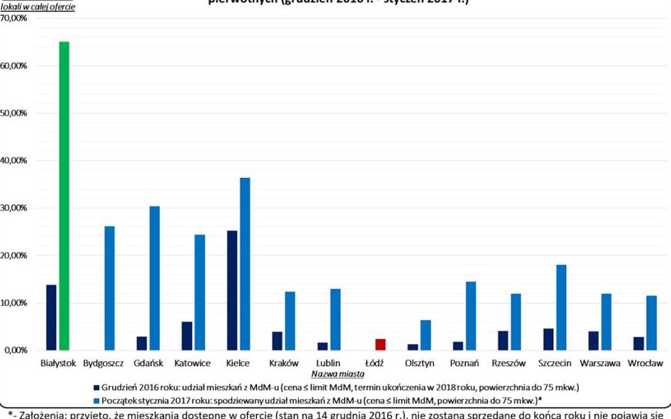 Na początku 2017 roku bardzo duży wzrost udziału nowych mieszkań z dopłatą będzie widoczny w Białymstoku, Bydgoszczy, Gdańsku, Katowicach, Krakowie, Lublinie, Poznaniu, Rzeszowie, Szczecinie, Warszawie oraz Wrocławiu. Pierwsze z wymienionych miast może być nieoczekiwanym liderem programu "MdM".