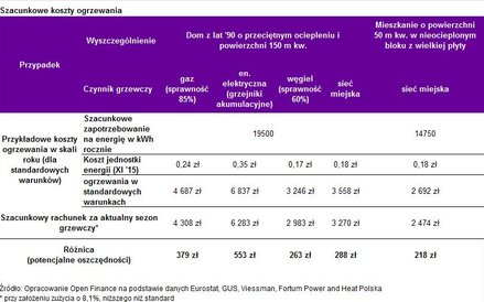 Wylicza, że jeszcze więcej mogą zaoszczędzić posiadający 150-metrowy dom z lat 90. Jeśli zima będzie łagodna, za ogrzewanie gazem trzeba będzie zapłacić 4,3 tys. zł (o 380 zł mniej), przy ogrzewaniu elektrycznymi grzejnikami akumulacyjnymi - 6,3 tys. zł (550 zł mniej), wykorzystując węgiel - około 3 tys. zł (ponad 260 zł mniej), a korzystając z usług przedsiębiorstwa grzewczego - niecałe 3,3 tys. zł (290 zł mniej).