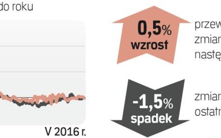 Aktualną średnią cenę porównujemy z przeciętną przed rokiem i przewidywaną za rok, uzyskując rzeczywiste i prognozowane zmiany wyrażone w procentach.