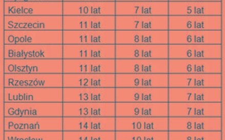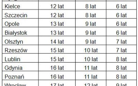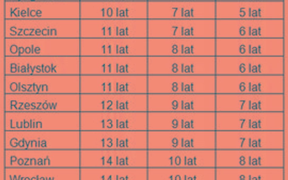 Obliczeń dokonaliśmy dla 17 miast, dla których NBP publikuje transakcyjne ceny mieszkań na rynku wtórnym. Okazuje się, że w pięciu lokalizacjach (Zielonej Górze, Łodzi, Kartowicach, Bydgoszczy i Kielcach) można kupić takie mieszkanie bez kredytu po 5 latach oszczędzania. To jednak przy założeniu, że nasze przykładowe małżeństwo będzie w stanie co miesiąc odkładać aż 40 proc. swoich dochodów, czyli 1993 zł.