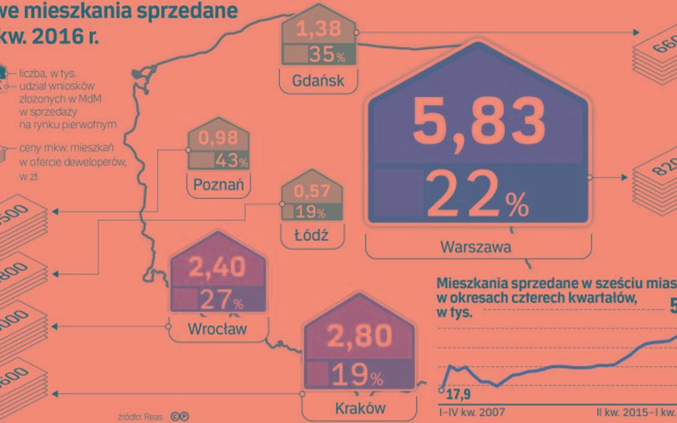 Od kwietnia 2015 do marca 2016 r. firmy deweloperskie rozpoczęły sprzedaż 54,3 tys. lokali. W tym czasie znalazły klientów na 54,7 tys. mieszkań – podaje Reas. Tak było w sześciu największych miastach kraju, gdzie rynek deweloperski kwietnie: w Warszawie, Krakowie, Wrocławiu, Trójmieście, Poznaniu i Łodzi.