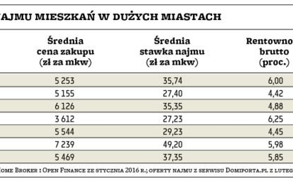 Marcin Krasoń zwraca uwagę, że pomijając czasowe promocje na lokaty krótkoterminowe i zwykle z ograniczoną kwotą, na bankowych depozytach drobny inwestor nie zarobi wiele. – W związku z rekordowo niskimi stopami procentowymi bankowe oferty rzadko przekraczają dziś 2 proc. netto rocznie. W porównaniu z nimi inwestycja w mieszkanie na wynajem wygląda bardzo atrakcyjnie – uważa analityk Home Brokera. – Nawet miasta z najniższą oczekiwaną rentownością najmu – jak Gdynia i Poznań z niecałymi 4 proc. rocznie netto – oferują znacznie więcej niż bankowe depozyty.