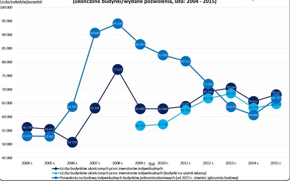 Podana wartość uwzględnia również domy, które na sprzedaż lub wynajem wybudowały osoby prowadzące działalność gospodarczą. Zaliczenie takich „minideweloperów" do grupy inwestorów indywidualnych, wynika z metodologii stosowanej przez GUS. Na szczęście Główny Urząd Statystyczny od 2009 roku podaje również liczbę budynków przeznaczonych na własny użytek, które ukończyli inwestorzy indywidualni. Statystyki GUS wskazują, że w 2015 r. prywatni inwestorzy oddali do użytku około 64 670 domów wzniesionych na własne potrzeby. Analogiczna wartość z 2014 r. była niższa o 2,16 proc.