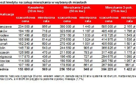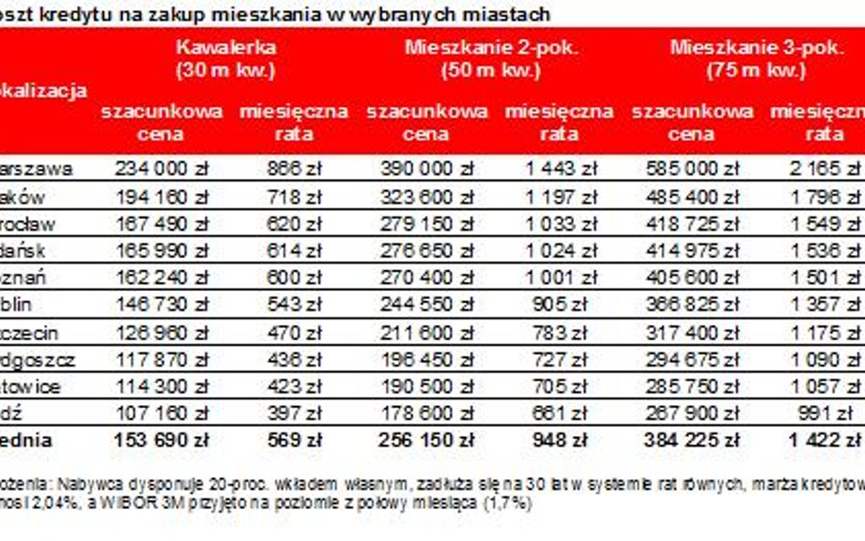 - Aby obliczyć ratę kredytu zaciągniętego na zakup mieszkania w dużym mieście, wzięto pod uwagę trzy główne czynnik - wyjaśnia Bartosz Turek. - To szacunkowa wartość mieszkania jedno-, dwu - i trzypokojowego w jednym z dziesięciu badanych miast, którą obliczono poprzez przemnożenie mediany ceny ofertowej z poprzedniego miesiąca oraz powierzchni charakterystycznej dla danej nieruchomości – 30 mkw. dla kawalerki, 50 mkw. dla mieszkania dwupokojowego i 75 mkw. dla mieszkania trzypokojowego - wyjaśnia Marcin Drogomirecki, analityk portalu Domiporta.pl. -Poza tym wzięliśmy pod uwagę wysokość przeciętnej marży kredytowej dla danego okresu (średnia z wyników ankiety przeprowadzonej wśród banków przez Tax Care) oraz wysokość stawki WIBOR 3M (notowanie z 15 dnia miesiąca publikacji - do lutego 2015 roku do obliczeń przyjmowano notowania z pierwszego dnia miesiąca, po zmianie metodologii powtórnie przeliczono wyniki; zmiana ma za zadanie jak najszybsze uchwycenie ewentualnych zmian stóp procentowych, o których Rada Polityki Pieniężnej przeważnie decyduje na początku miesiąca).