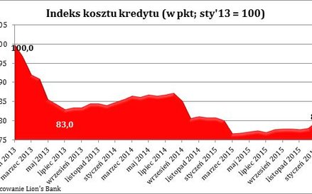 - Wartość indeksu kosztu kredytu (IKK) w styczniu tego roku osiągnęła poziom 80 pkt. Czym jest indeks stworzony przez Lion's Bank i portal nieruchomości Morizon.pl? Ma za zadanie w prosty sposób prezentować, jak zmienia się miesięczna rata kredytu zaciąganego na zakup mieszkania w dużym polskim mieście - wyjaśnia Bartosz Turek. - Co miesiąc badamy więc, biorąc pod uwagę ceny nieruchomości i warunki kredytowe, z jaką ratą musiałby liczyć się potencjalny nabywca mieszkania. Aktualna wartość sugeruje, że chcąc kupić mieszkanie na kredyt w jednym z dziesięciu największych polskich miast, trzeba się liczyć z kosztem wyraźnie wyższym niż przed miesiącem (2,4 proc.). Wszystko dlatego, że aż 10 z 16 przebadanych banków zadeklarowało w styczniu, że żądają wyższego oprocentowania kredytu niż jeszcze miesiąc wcześniej. W efekcie dziś średnia marża kredytowa dla trzyosobowej rodziny z dochodem 5 tys. zł netto, która chciałaby się zadłużyć na 30 lat z jak najniższym wkładem własnym wynosi ponad 2 proc., podczas gdy w grudniu 2015 roku szacowana była na około 1,7 proc.