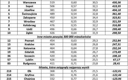 Oprócz Piaseczna, Warszawy i Wrocławia w pierwszej dziesiątce rankingu znajdziemy również wyludniającą się Łódź, dwa podwarszawskie miasta (Józefów oraz Ząbki), a także miejscowości znane z walorów turystycznych (Sopot, Zakopane, Świnoujście i Kołobrzeg).