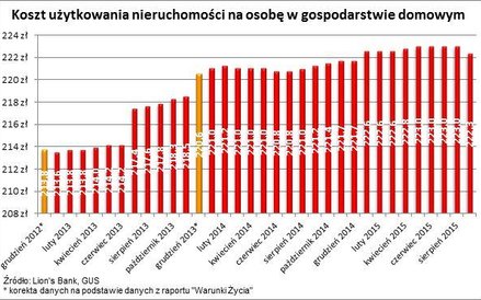 Na koszty utrzymania mieszkania składają się m.in. koszty eksploatacyjne, wywóz śmieci, kanalizacji, energii i wody. - Na podstawie tempa wzrostu cen można szacować, że dziś na utrzymanie mieszkania czteroosobowa rodzina wydaje 889,3 zł - podaje Bartosz Turek. - Wynik ten jest niższy niż sierpniowy, a w perspektywie ostatnich 12 miesięcy podniósł się o skromne 4,4 zł. Warto jednak zauważyć, że w dłuższym terminie koszt utrzymania nieruchomości rośnie przeważnie znacznie szybciej niż inflacja. Na przykład przez ostatnie pięć lat rachunki związane z mieszkaniem rosły dwa razy szybciej niż ogólny poziom cen.