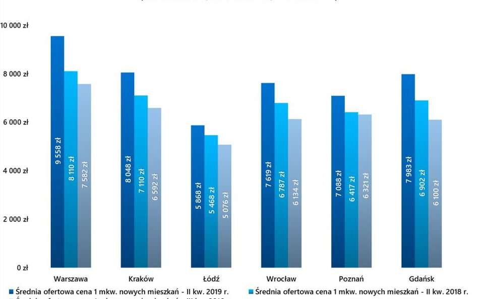 Informacje naszego portalu wskazują, że w ciągu trzech lat (III kw. 2016 r. - II kw. 2019 r.) średnia ofertowa cena 1 mkw. mieszkań deweloperskich zmieniła się następująco: