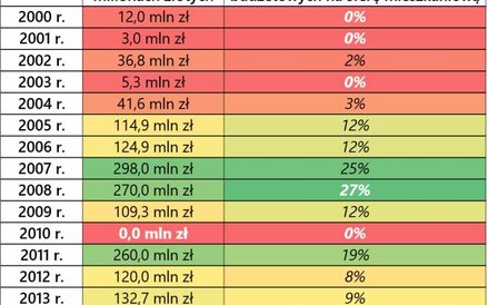 Po przeanalizowaniu poniższej tabeli uwagę zwraca bardzo zróżnicowany poziom wydatków, jakie budżet państwa przez lata ponosił na finansowanie funduszy termomodernizacyjnych. Przykładowo w 2010 r. działalność Funduszu Termomodernizacji i Remontów nie pochłonęła żadnych środków z budżetu. Później wydatki przeznaczone na działanie tego funduszu zmieniały się skokowo (np. z 330 mln zł w 2014 r. do 120 mln zł w 2015 r.). Cele dotyczące termomodernizacji i remontów pochłonęły największą część łącznych wydatków budżetu na sferę mieszkaniową w 2008 r. (27 proc.), 2007 r. (25 proc.) i w 2014 r. (21 proc.). Planowany wynik dla 2019 r. to zaledwie 6 proc. Prace termomodernizacyjne i remontowe przy budynkach wielorodzinnych były wspierane także z innych źródeł (m.in. unijnych). Tym niemniej brak stabilnego finansowania obydwu funduszy termomodernizacyjnych raczej nie świadczy dobrze o polityce mieszkaniowej kolejnych rządów.