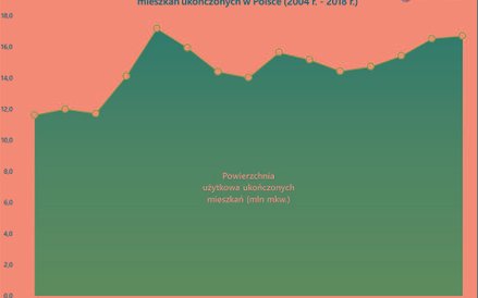 Przez cały analizowany okres (lata 2004 - 2018), GUS tylko raz odnotował większą wartość. Mowa o wyniku z 2008 r. wynoszącym 17,19 mln mkw. Wielu deweloperów kończyło wtedy mieszkania, których budowy rozpoczęto na początku boomu hipotecznego. Takie lokale były relatywnie duże (podobnie jak powstające prywatne domy), ponieważ banki liberalnie oceniały zdolność kredytową i kusiły niskim oprocentowaniem kredytów w CHF.