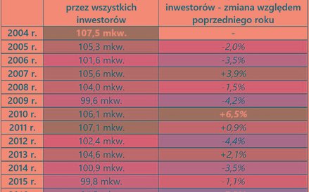 Dane GUS wskazują, że w 2018 r. łączna powierzchnia wszystkich mieszkań ukończonych przez inwestorów wzrosła o 1 proc. Bardziej zwiększyła się całkowita liczba ukończonych mieszkań (lokali i domów). Ostateczne informacje urzędu wskazują, że od stycznia do grudnia 2018 r. oddano do użytku o 3,8 proc. więcej mieszkań niż rok wcześniej. Taka rozbieżność poziomu rocznych zmian (1,0 - 3,8 proc.) sugeruje spadek przeciętnej powierzchni mieszkania ukończonego przez wszystkich inwestorów.