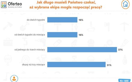 - Po znalezieniu odpowiedniej ekipy trzeba zaczekać, aż będzie mogła rozpocząć pracę. W przypadku 37 proc. ankietowanych trwało to od miesiaca do trzech - podaje Karol Grygiel z zarządu Oferteo.pl. - U 31 proc. trwało to nawet więcej niż trzy miesiące. Znaleźli się też tacy, którzy czekali mniej niż miesiąc (16 proc.), a nawet poniżej 2 tygodni (16 proc.).