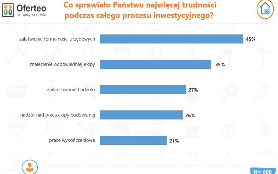 W odpowiedzi na pytanie: co sprawiało państwu najwięcej trudności podczas całego procesu inwestycyjnego, 45 proc. ankietowanych przez Oferteo.pl wskazało sprostanie urzędowym formalnościom, a 35 proc. - znalezienie odpowiedniej ekipy budowlanej. - W dalszej kolejności wymieniane było: zbilansowanie budżetu (27 proc.) czy prace wykończeniowe (21 proc.). Po znalezieniu odpowiedniej ekipy i rozpoczęciu budowy, inwestorzy musieli jeszcze nadzorować jej prace i właśnie to 26 proc. respondentów wspomina jako najtrudniejsze - mówi Karol Grygiel.