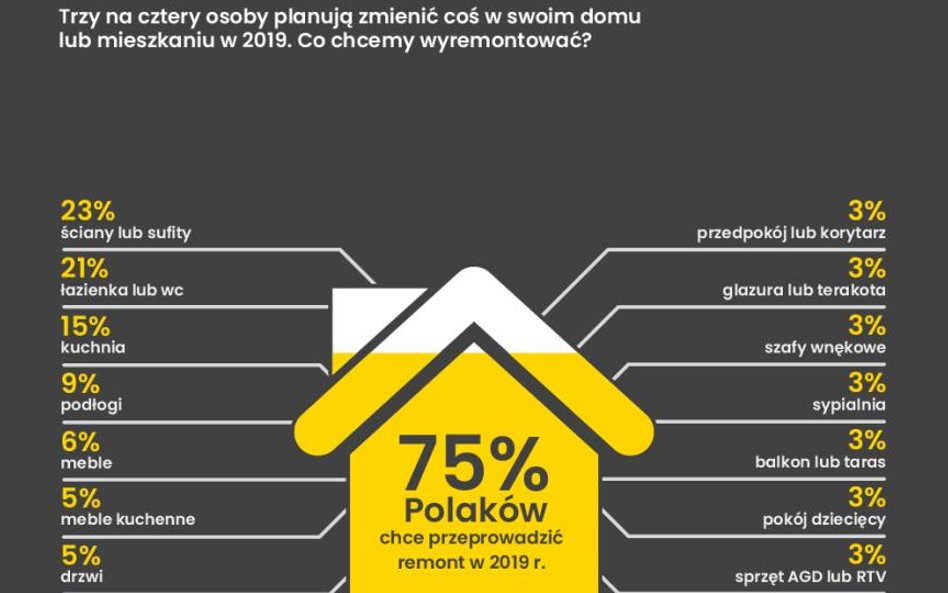 Raport został opracowany na podstawie badania, którego uczestnicy odpowiedzieli na pytania dotyczące m.in. rodzaju przeprowadzanych prac, odnawianych pomieszczeń i wydatków na remonty w 2018 r. Autorzy raportu podają, że w ubiegłym roku remont przeprowadziło aż 46 proc. Polaków - przede wszystkim mieszkańcy zachodniej części kraju. Większość remontujących zdecydowała się skorzystać z pomocy specjalisty. Na własną rękę do pracy zabrała się tylko co trzecia osoba.